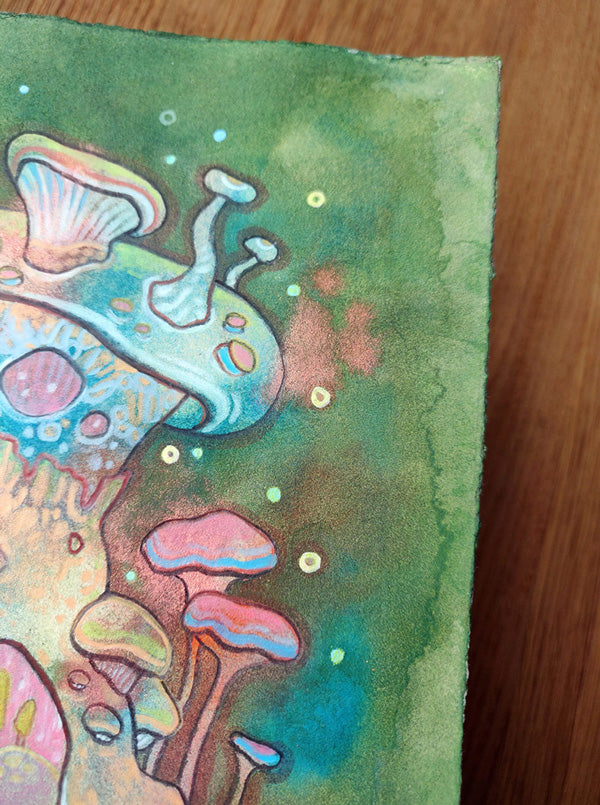 'Festive Fungi 5/5' er malet med bl.a. pigmentbaseret blæk, farveblyanter og metallic guld/kobber pigment på 250g syrefrit mix media papir.